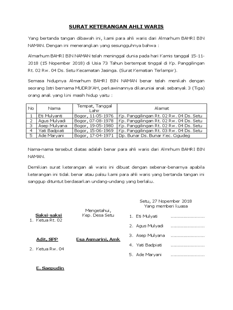 Budi susanto, tempat tinggal terakhir di jl. Nah kami sudah menghimpun ratusan contoh surat kuasa yang bisa anda ambil sebagai contoh dalam membuat surat kuasa sesuai yang anda butuhkan. Berikut ini adalah sebuah contoh surat kuasa yang merupakan sebuah format surat kuasa ahli waris yang digunakan dalam kegiatan pembagian ha. Dari sekian banyak contoh surat kuasa dan jenis surat kuasa yang ada, contoh yang kami sebutkan di ataslah. Mungkin ada banyak urusan yang harus anda selesaikan atau anda 17. Membuat surat kuasa ahli waris untuk jual beli tanah memang sulit, apalagi jika kita tidak pernah melihat contoh surat kuasa tanah sebelumnya. Surat kuasa pada dasarnya merupakan surat keterangan dari seorang pemilik kuasa yang memberikan kuasa yang ia miliki pada orang lain. Ketika seseorang meninggal dan meninggalkan harta. Download as docx, pdf, txt or read online from scribd. File draf surat kuasa ahli waris ini berisi pemberian kuasa dari para ahli waris untuk melakukan pembagian dan pengaturan harta warisan kepada setelah anda melakukan pembayaran melalui transfer bank, silahkan kirim sms notifikasi ke nomor 081310322957 dengan format sms sebagai. Contoh surat kuasa ahli waris. Pengurusan surat ini mesti menggunakan surat resmi yang bisa diperoleh di kantor kantor taspen seluruh indonesia atau bisa juga di dapatkan saat pengajuaan pensiun di kantor. Contoh diatas ialah teladan surat yang digunakan di taspen banjarmasin.